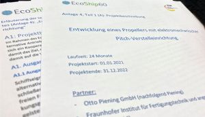 Das FuE-Projekt zur Entwicklung eines Propellers mit elektromechanischer Pitch-Verstelleinheit wird vom Zentralen Innovationsprogramm Mittelstand gefördert. Das auf zwei Jahre angesetzte Projekt geht zum 1. Januar 2022 an den Start. Der Förderantrag durchlief zuvor eine technische, wirtschaftliche und administrative Prüfung. Das Vorhaben geht auf eine Kooperation zwischen der Otto Piening GmbH (Piening Propeller) und dem Fraunhofer IFAM zurück und ist in zwei Forschungsschwerpunkte gegliedert. Zum einen wird ein kompakter E-Motor (Fraunhofer IFAM) entwickelt, welcher elektronisch die Steigung der Propellerflügel steuert, zum anderen eine mechanische Verstelleinheit (Piening), die mittels des E-Motors eine Steigungsverstellung der Propellerflügel ermöglicht. Die neue Propeller-Verstelleinheit soll dabei schnellere Manöverwechsel bei zugleich geringerer Wartungsintensität ermöglichen. Hierfür wird auf Hydrauliköl sowie Ölschmierungen verzichtet, wodurch Ölwechsel und ein möglicher Ölaustritt entfallen sowie etwaige Umweltbelastungen vermieden werden. Die Konstruktion wird vor allem für kleinere Schiffe ausgelegt. Diese weitere ölfreie Verstellmöglichkeit erweitert das Portfolio von Piening Propeller, die bereits einen mit Wasserhydraulik betriebenen Verstellpropeller erfolgreich im Markt platziert haben.
