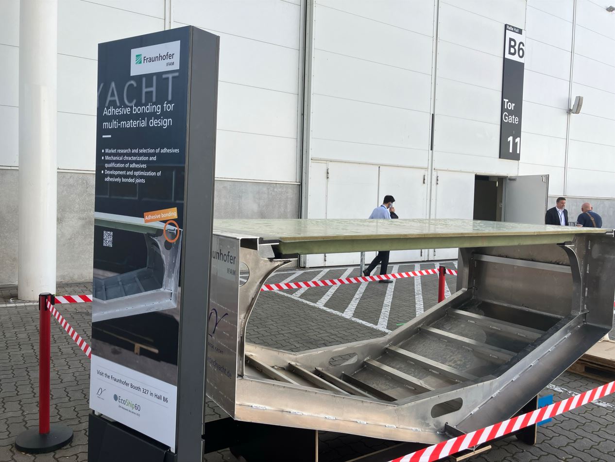 EcoShip60-Partner Bernhard Schneider (Fraunhofer IFAM) hat auf der SMM im September 2024 einen Demonstrator ausgestellt, der die Forschungserkenntnisse aus dem FuE-Projekt „Lasttragende Rumpf-Deck-Verbindung für Materialkombinationen im Bootsbau“ veranschaulicht.